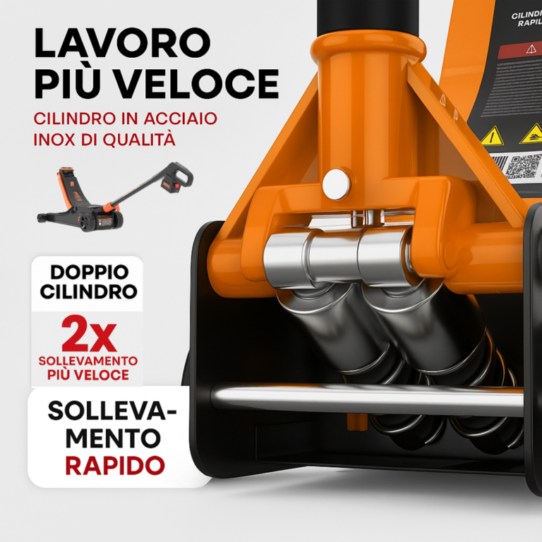 Con la manovrabilità facilitata delle sue ruote puoi guidare il cric con una sola mano, anche in spazi angusti o su superfici irregolari, rendendo ogni operazione semplice e veloce.